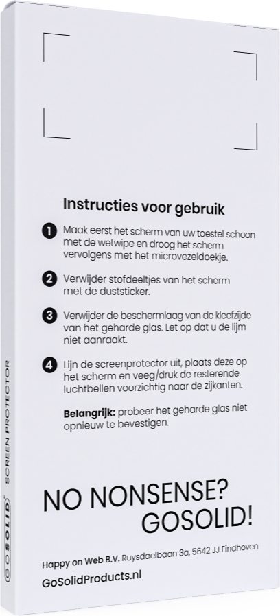 - Lijn de screenprotector uit, plaats deze op het scherm en veeg/druk de resterende luchtbellen voorzichtig naar de zijkanten.